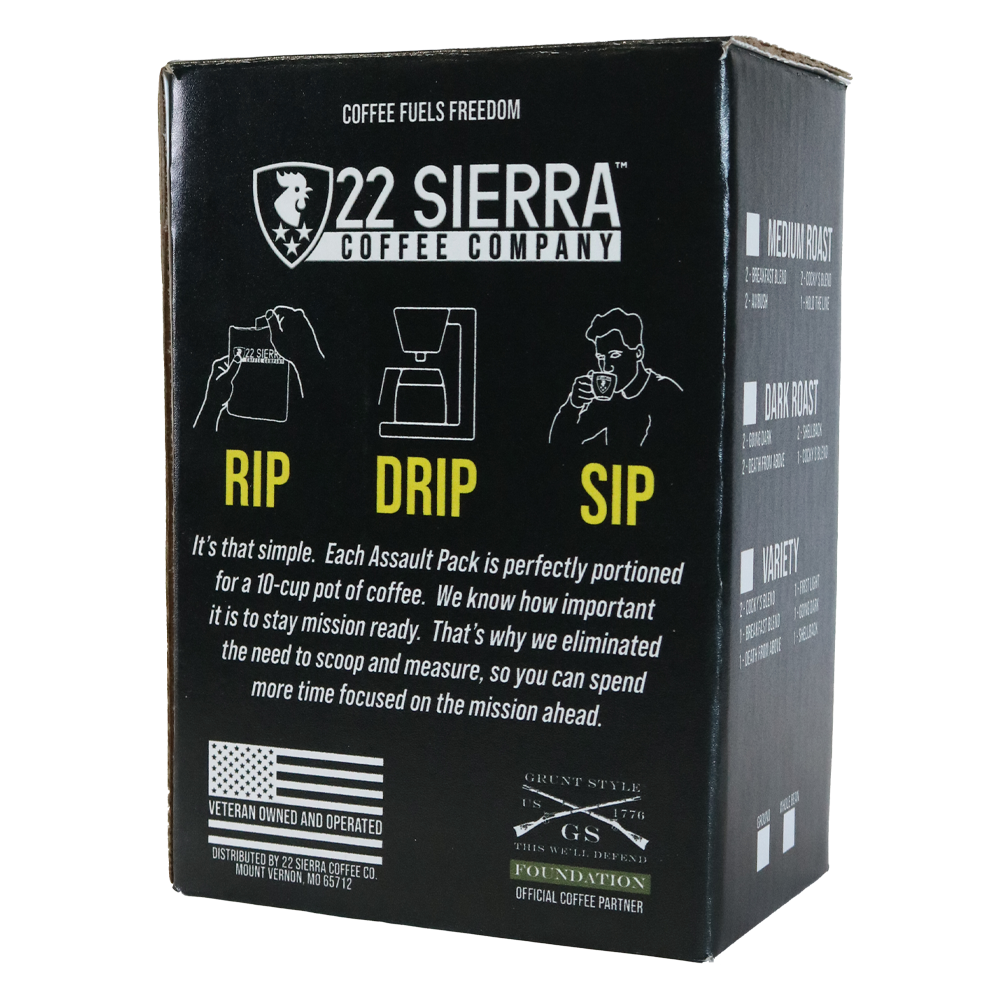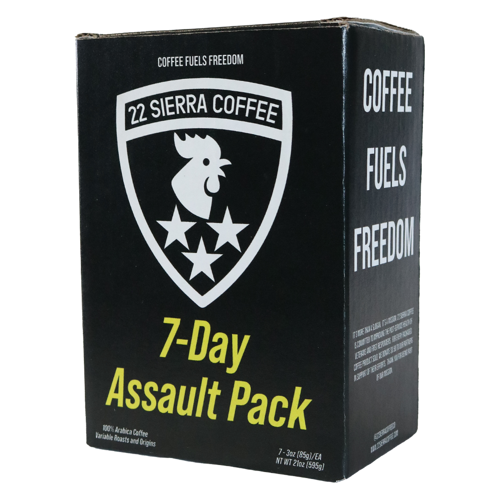 Stay mission-ready with our 7-Day Assault Pack. Designed for convenience and freshness, this box includes seven individually packaged portions of our specialty-grade coffee, each perfectly measured to brew a 10-cup pot. Whether you’re gearing up for a busy workday or tackling your morning mission, the 7-Day Assault Pack keeps your coffee routine simple and efficient.
